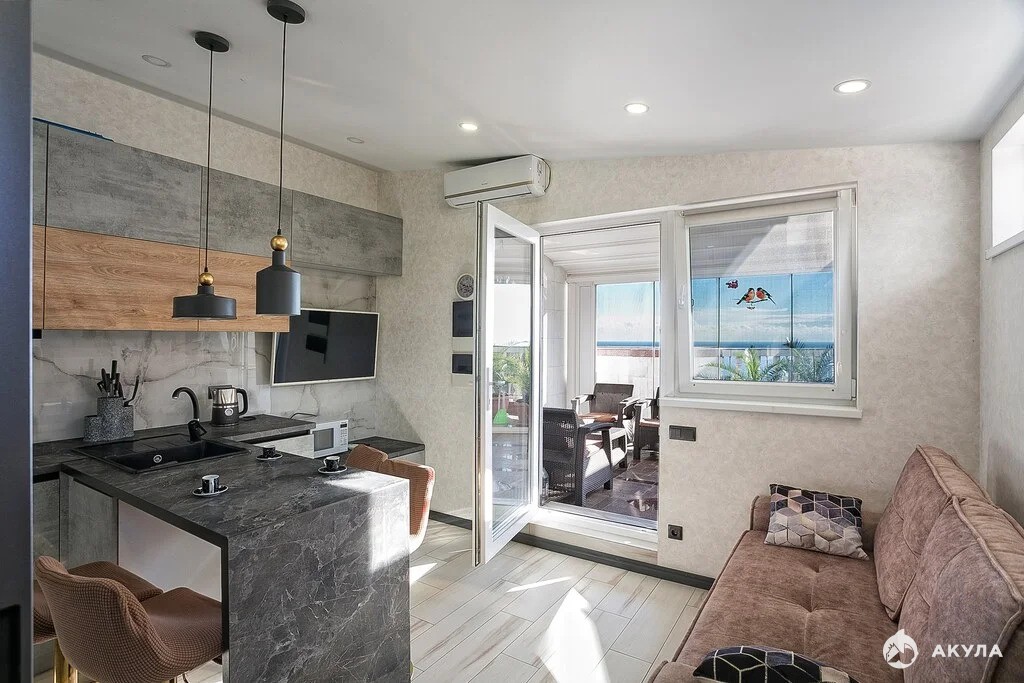 В апартаментах два входа, два санузла, выполнен дизайнерский ремонт, с новой мебелью и техникой. Есть своя закрытая терраса с видом на море
